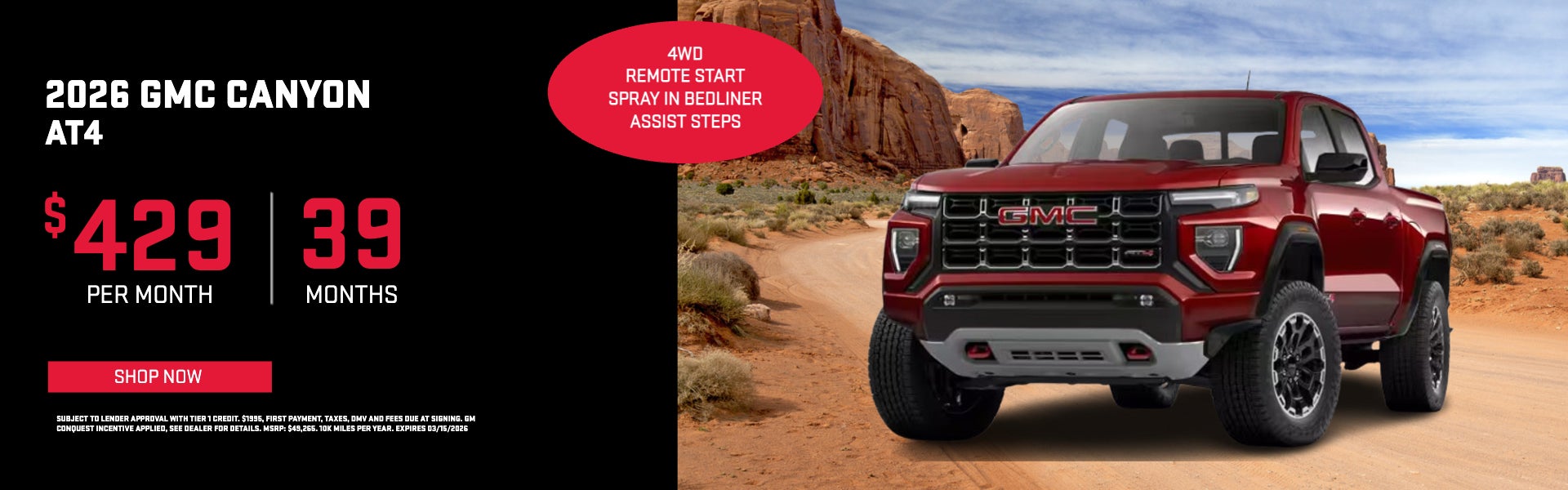 Subject to lender approval with tier 1 credit. $1995, First payment, taxes, DMV and fees due at signing. GM Conquest incentive applied, see dealer for details. MSRP: $49,265. 10K miles per year. Expires 03/15/2026